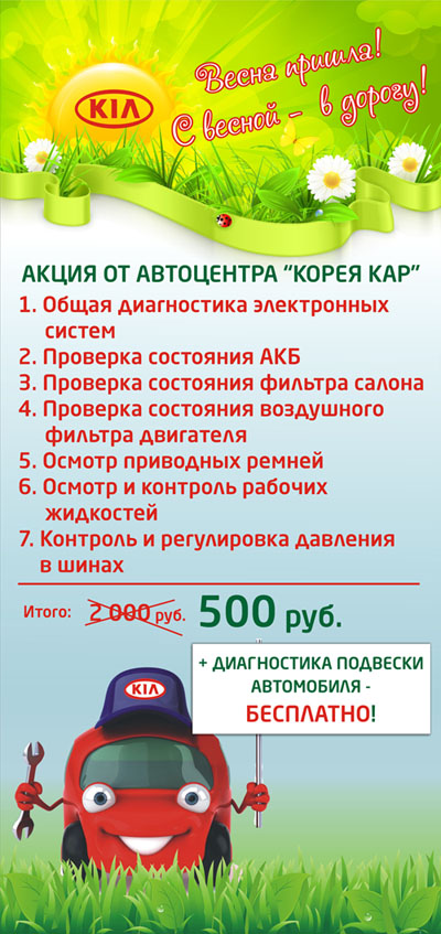 Условия акции включают в себя подготовку автомобиля КIA к весенне-летнему сезону всего за 500 рублей, а также приятный бонус ― СОВЕРШЕННО БЕСПЛАТНУЮ диагностику подвески. Подготовьте вашего железного коня к новому сезону на выгодных условиях! Подробности по телефону: (4912) 500-200 и на дилерского центра «Корея Кар».