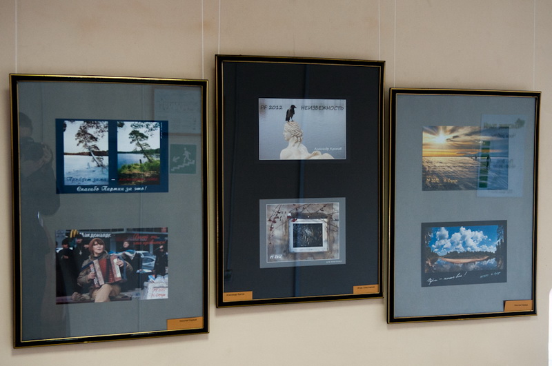 Несмотря на то, что тема фотооткрыток заявлена как новогодняя, на снимках изображено всё подряд — от обнажённого женского абриса до божьих коровок. Видно, что участники несли самое лучшее, разумеется, каждый в меру опыта и таланта. У кого-то на снимке сани, запряжённые лихой тройкой, у кого-то заснеженные хаски или лупоглазые совы, у кого-то богатый летний улов. Ну и демисезонные котики, как всегда, вне конкуренции. На фоне всякого разного взгляд цепляется за серию городских закатных пейзажей Николая Середы. Рядом с его работами вообще хочется задержаться: во-первых, карточки красивые, а во-вторых, уж шибко они мелкие, приходится долго вглядываться. Благо есть во что — линии хорошо знакомой архитектуры подаются под широким углом и с поистине королевским размахом. Тут уж не хочется придираться, что фото откровенно относятся к летне-осеннему периоду и Новым годом даже не пахнут. Если открытка в стиле «феличиты» должна нести радость, то эти карточки с поставленной задачей справляются достойно.