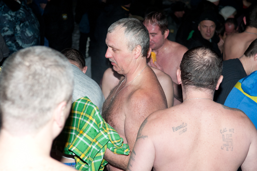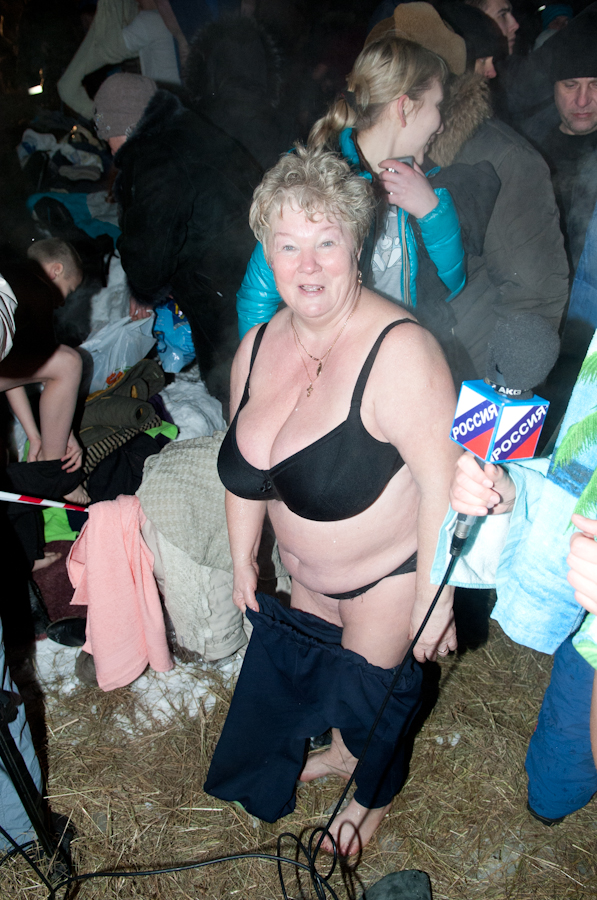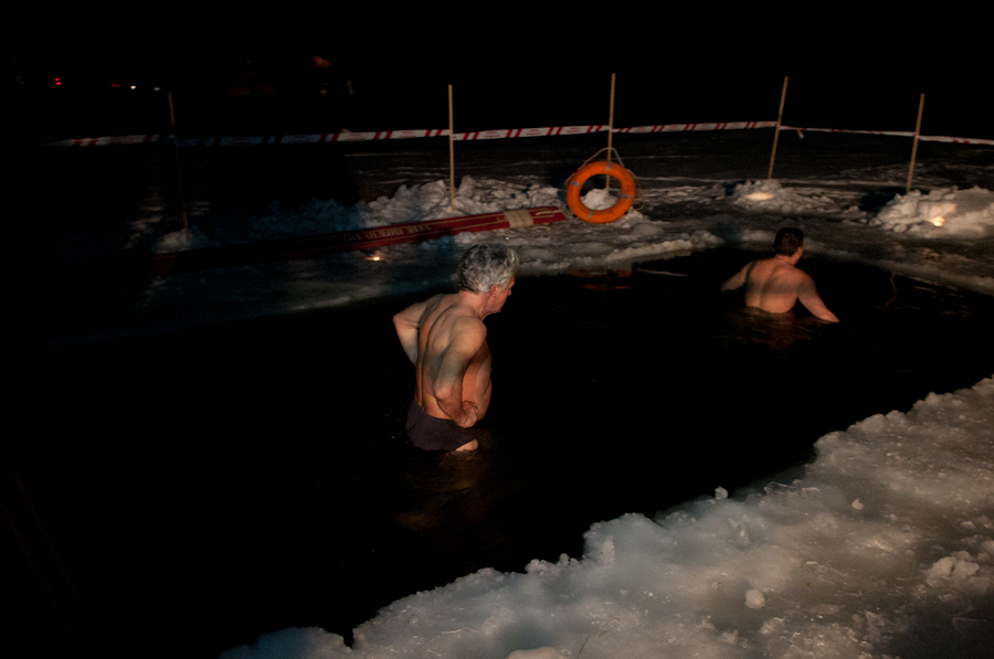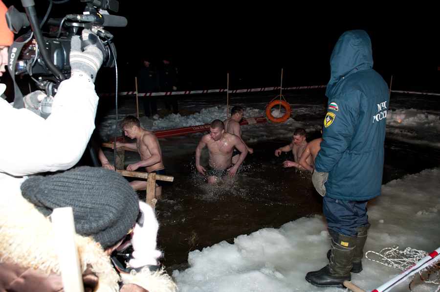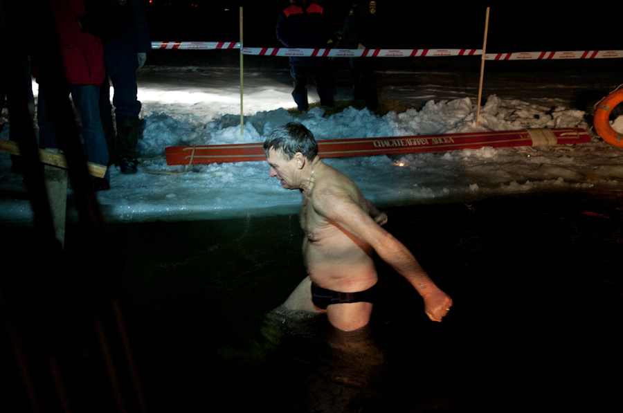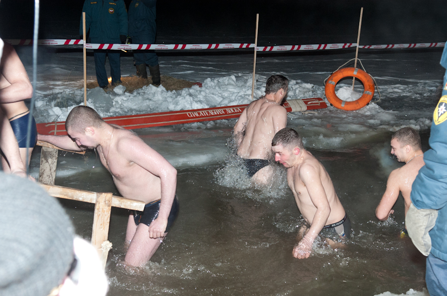 Завершив чин освящения воды, иерей Павел Коньков пожелал всем верующим хорошего купания и излечения всех бед и горестей, душевных и телесных. Затем первые рязанцы окунулись в воды озера. Купание проходило очень динамично. Многие из тех, кто в этот вечер решили окунуться в ледяную воду, делали это в первый раз. Из-за новизны ощущений опускались в воду они существенно медленнее, чем потом из неё выходили. Больше всего среди купающихся было мужчин, женщин решалось на такое существенно меньше — они предпочитали просто подойти к иордани и омыть освящённой водой лицо и руки. Как рассказал рязанец Михаил (на фото у него берёт интервью корреспондент «Вестей»), который первый из горожан в 2012 году погрузился в освящённую воду Орехового озера, «купаться в иордани совершенно не холодно, даже, наоборот, разогреваешься так, что и водка позавидует». По его словам, он постоянно посещает крещенские торжества и обряд купания никогда не пропускает, благодаря чему весь год потом не болеет и чувствует себя прекрасно.