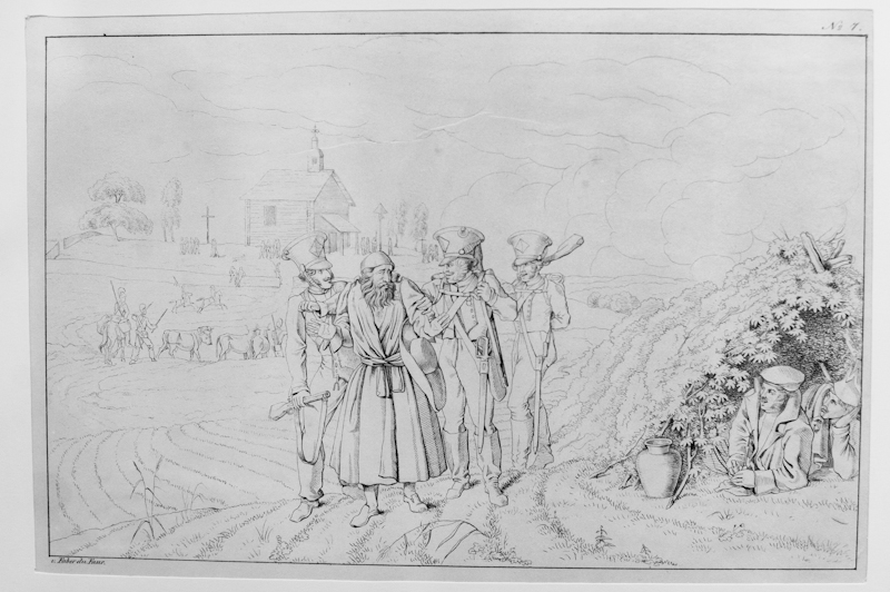Несмотря на тяжёлое положение, автор не забывает в своих записках пошутить: «Четверо иудеев, по всей видимости, отец, мать, дочь и сын, стоят на пороге своего дома. Родители, явно оценивающие, какое впечатление на иностранцев произведут прелести их дочери, поручили ей торговать провиантом. Удался ли торг? Гренадёр, опирающийся на дверь дома, похоже, имеет шансы на успех, который, возможно, и не входил в расчёты родителей», — такая запись сопровождает соответствующую литографию. Впрочем, чем ближе конец экспозиции (и бесславное окончание кампании), тем в работах и пояснениях меньше юмора. Горы трупов, замерзающие на русском морозе вояки, полузасыпанные сугробами павшие лошади: «Здесь изображена одна из сцен, повторяющихся изо дня в день. Раненый офицер с женой с большим трудом добирались до этих мест, и вот лошадь их пала. …Их ждут или плен, или смерть на лютом морозе». В одной из последних пояснительных записок дю Фор подводит неутешительный итог всей Русской кампании и выносит вердикт своей армии: «Этот город, который Великая армия, такая блестящая, такая многочисленная и такая жадная до славы, пересекла, гоня перед собой неприятеля, теперь встречал своими пустынными улицами жалкие остатки нашей армии, побеждённой голодом и климатом России и стремящейся достичь берегов Немана».
