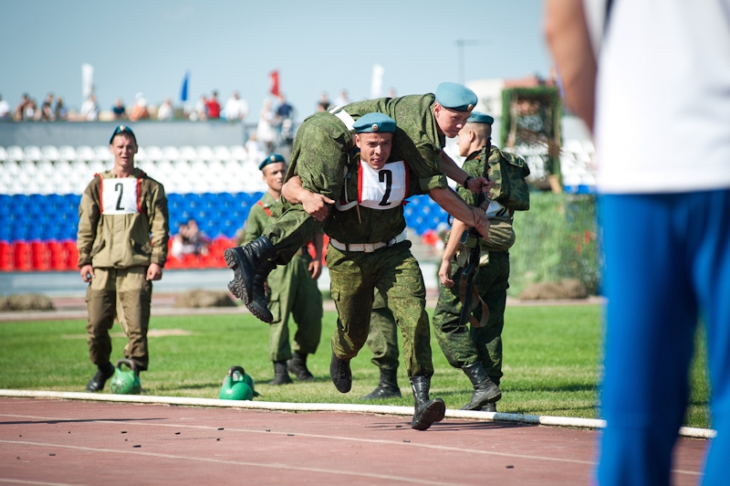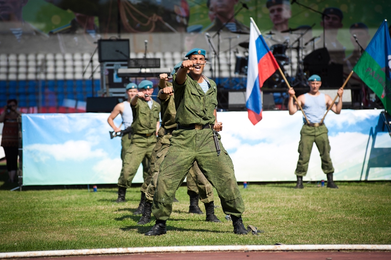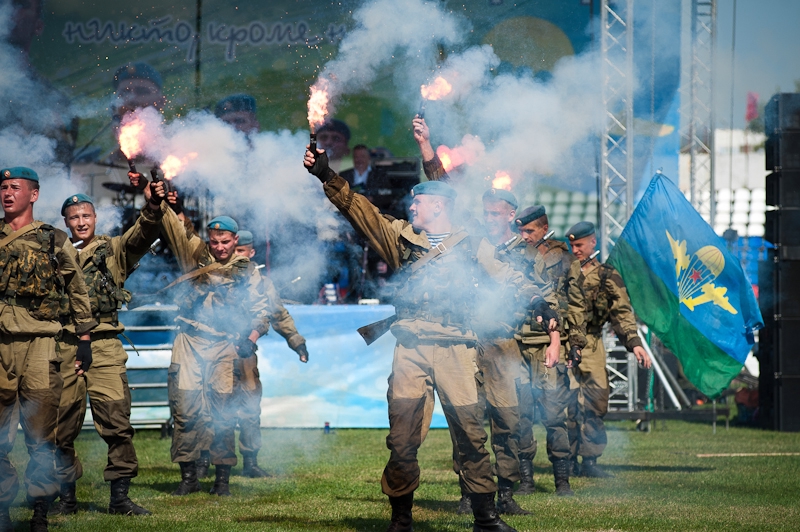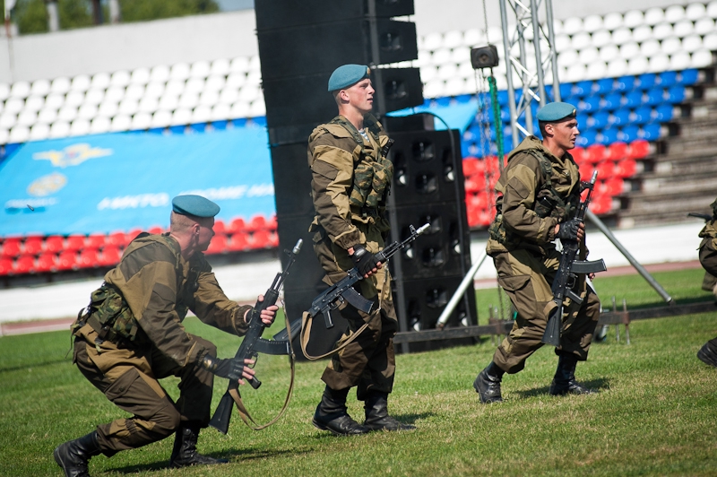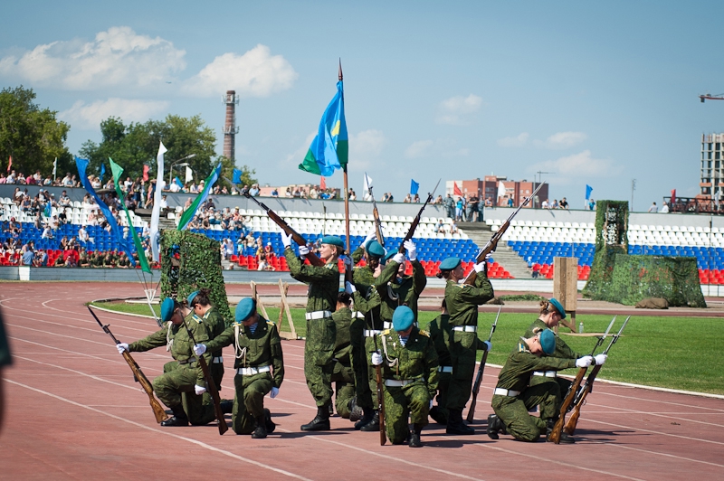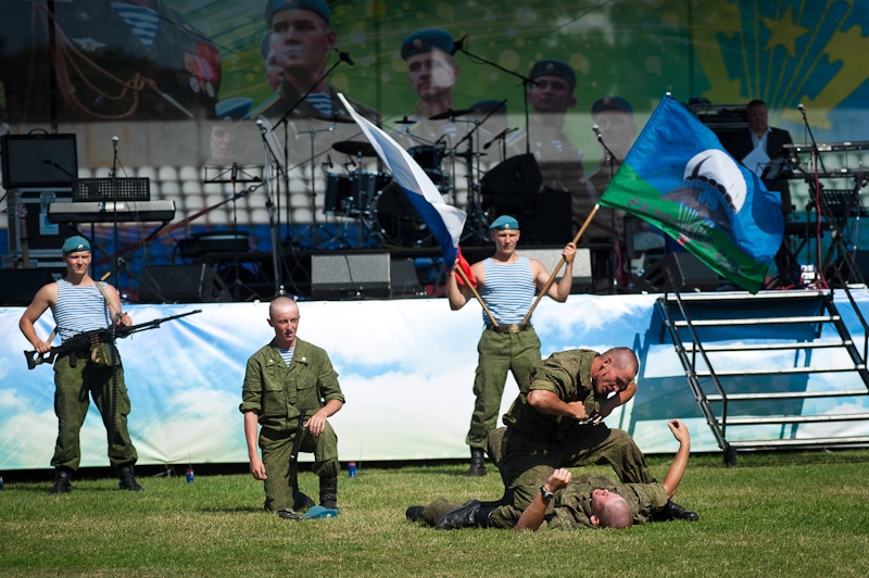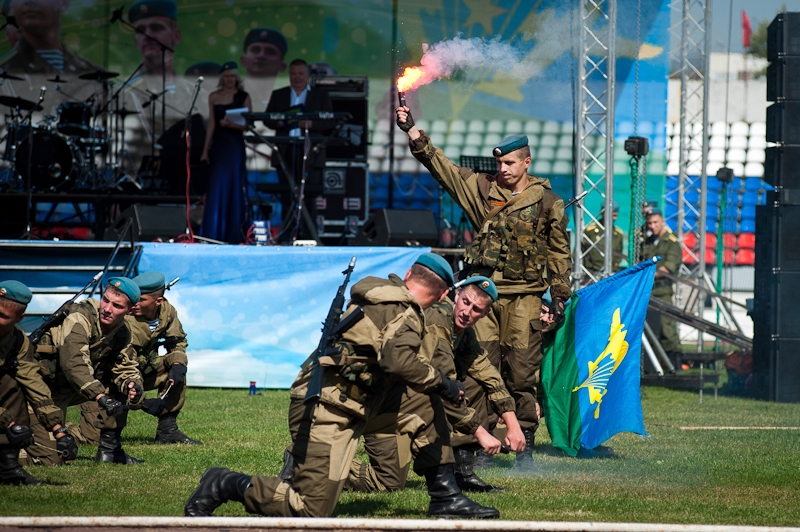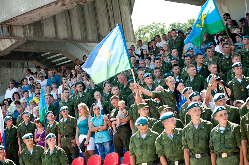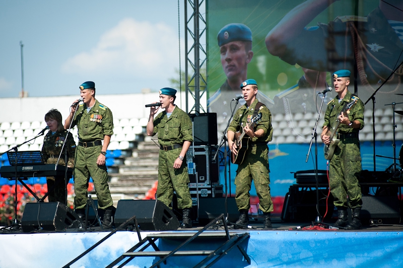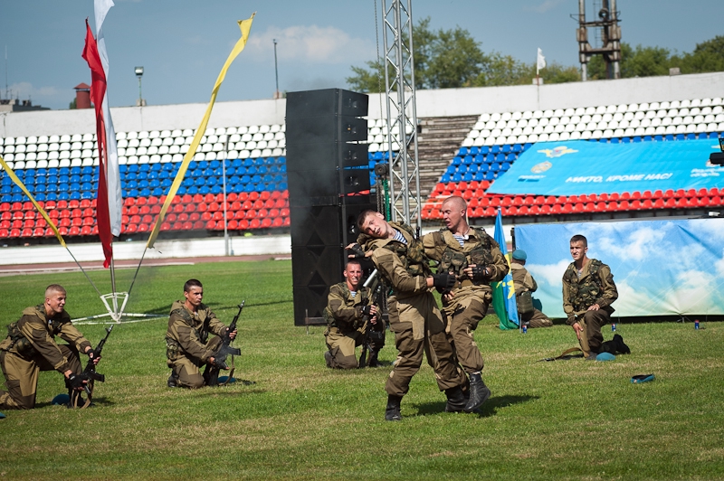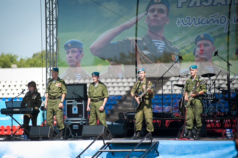 По традиции на ЦСК город поздравлял десантников, а десантники — себя и город. Но, даже особо не всматриваясь, было заметно, что в фаворе лишь один из торжественных поводов. И пусть над стадионом развевались три флага: России, Рязани и Военно-десантных войск, зелёно-голубой флаг с парашютистом реял, казалось, выше и веселее. Среди выступающих особо выделились девушки из женской роты почётного караула — гордость рязанского десанта, как представил их ведущий праздника Николай Плетнёв. С восторгом были встречены показательные полёты пилотажной группы «Соколы России». В дальнейшем развлекательно-спортивная часть праздника опустилась на плечи самих виновников торжества — десантники пели и играли на гитарах, дрались и захватывали дислокации потенциальных противников, бегали в противогазах и переносили раненых, жонглировали брёвнами и кидались сапёрными лопатками, стреляли холостыми и время от времени сеяли панику в рядах журналистов. Показательные выступления наглядно продемонстрировали, что пока в России есть ВДВ, бояться нам нечего. Под занавес мероприятия была проведена традиционная эстафета между воспитанниками РВВДКУ, в которой победителями вышли, разумеется, студенты воздушно-десантного факультета. После этого стадион перешёл в руки детей, прилежно дожидавшихся возможности собрать коллекцию гильз после выступлений десантников. А в финале праздника с поздравлениями и большим сольным концертом выступил Народный артист России Дмитрий Певцов.