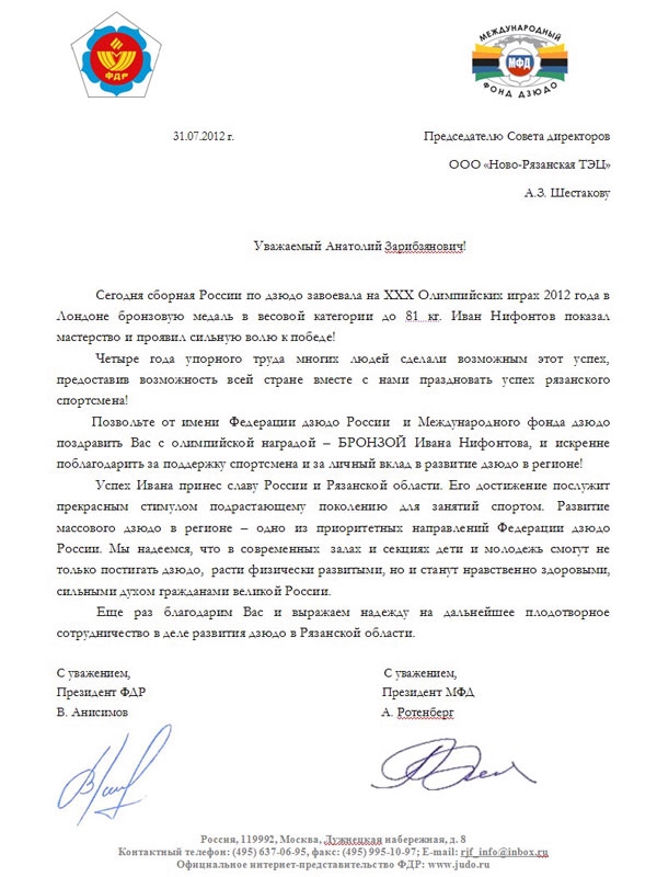 Ивана Нифонтова и Дмитрия Сергеева поздравил исполняющий обязанности директора Рязанского филиала ООО «Ново-Рязанская ТЭЦ» Георгий Малышев вместе с юным спортсменом по греко-римской борьбе Юрой Новиковым. Георгий Малышев преподнёс Ивану Нифонтову букет цветов и подарки. В ответ Дмитрий Сергеев вручил Анатолию Шестакову благодарственное письмо на его имя от президента федерации дзюдо России Василия Анисимова и президента Международного фонда дзюдо Аркадия Ротенберга за поддержку спортсмена Ивана Нифонтова и за личный вклад в развитие дзюдо в регионе. Как известно, инициатором создания Международного фонда дзюдо является президент России Владимир Путин.