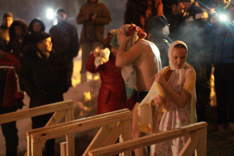 И хотя церковь никого к купанию в холодной воде в крещенский мороз не принуждает, желающих ощутить себя в святой купели Орехового озера в ночь на 19 января оказалось немало, по подсчётам благостных полиционеров, не менее двух сотен душ. После водоосвящения в иордань по заботливо уложенному настилу из соломы (дабы не поскользнуться) устремились раздевшиеся рязанцы — в большинстве своём крепкие юноши и зрелые мужи, из-за спин которых редко выныривали как барышни в купальных костюмах, так и совсем юные девицы в длинных одеждах и (как положено) с покрытой головой.