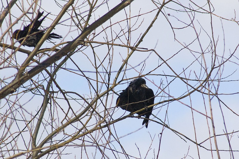 На иве заливались трелями семь щеглов, а рядом, пониже, отряхивались два грача. Наверное, на радостях искупались.