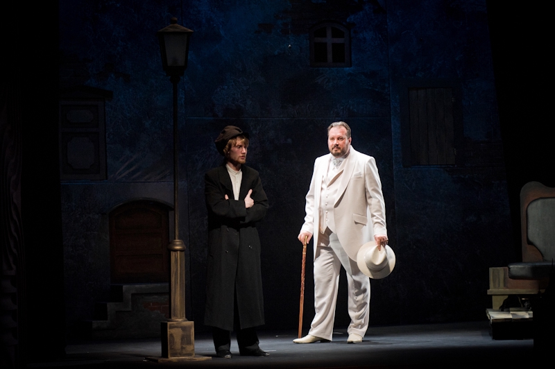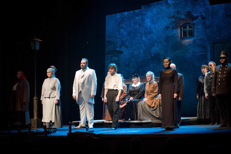 В ролях задействовали практически всю труппу театра, даже хватило на долю директора Константина Кириллова. Отец рязанской антрепризы на сцене нынче появляется редко, уйдя с головой в хозяйственные дела. И глядя на его по-барски роскошного Аркадия Свидригайлова, тут же становится обидно за сложившееся положение дел. Других неожиданных актёрских появлений в постановке нет: Расколькников — разумеется, Василий Уточкин, Соня — само собой, Светлана Борисова (Екатерина Волкова в другом составе), следователь — Владимир Коняхин, Лужин — Валерий Скиданов, Мармеладов — Валерий Рыжков… В какой-то момент начинает казаться, что это не режиссёр грамотно распределил роли, а сам Достоевский написал роман специально под рязанскую труппу — настолько все артисты на своих местах и при своих типажах. Подобная фантазия могла бы вызвать возмущение, однако после топора в голове процентщицы и при условии общей иллюзорности происходящего, тут вряд ли чему-то можно удивиться. И авансцена, вынесенная далеко в зрительный зал, поражает лишь в первые секунды, а потом кажется, что она тут была всю жизнь, а если и не была, то непременно должна была быть. И театр теней, перемежающийся с привычным действием, после первого «ах!» выглядит таким родным и уместным. Непривычные для нашего города сценические находки показываются не с позиции «мы и вот так можем!», а тонко и деликатно вплетаются в канву всего спектакля, заставляя смотреть во все глаза.