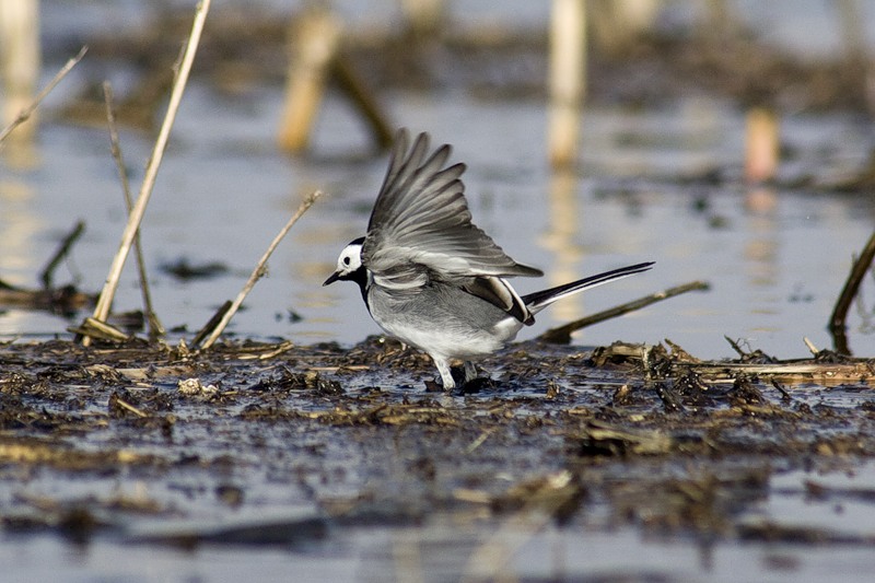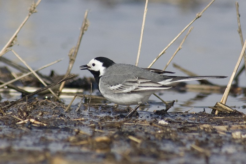 Трясогузка пасется на грязи. Под ней - земля, сантиметров пятнадцать талой воды и куча соломы и гнилой травы на поверхности.