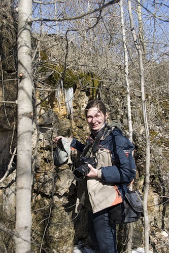Сверху видно, как бурно впадает в реку ручеек, текущий с другого берега, от основных щебеночных карьеров. На самих скалах Алексей углядел через ветки берез шикарные сосульки. Лазить туда было очень интересно.