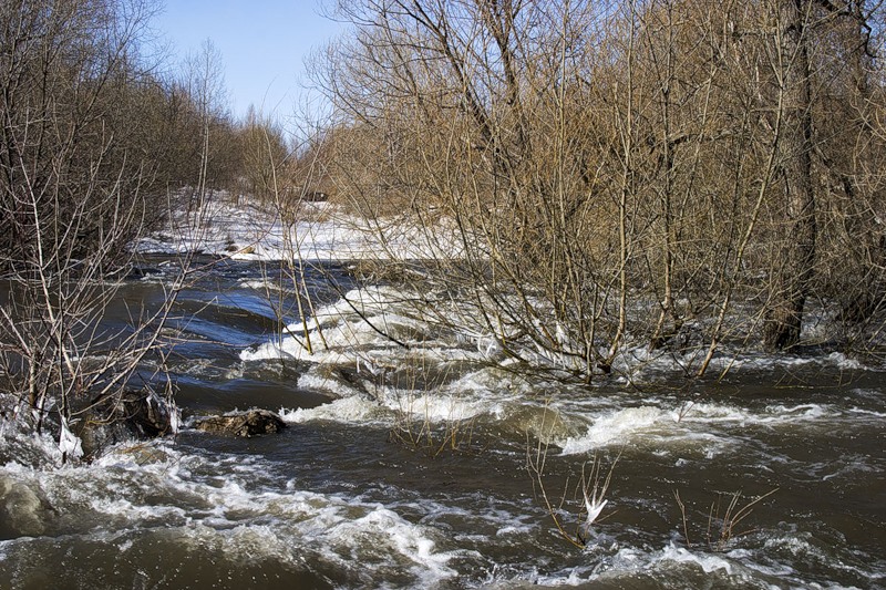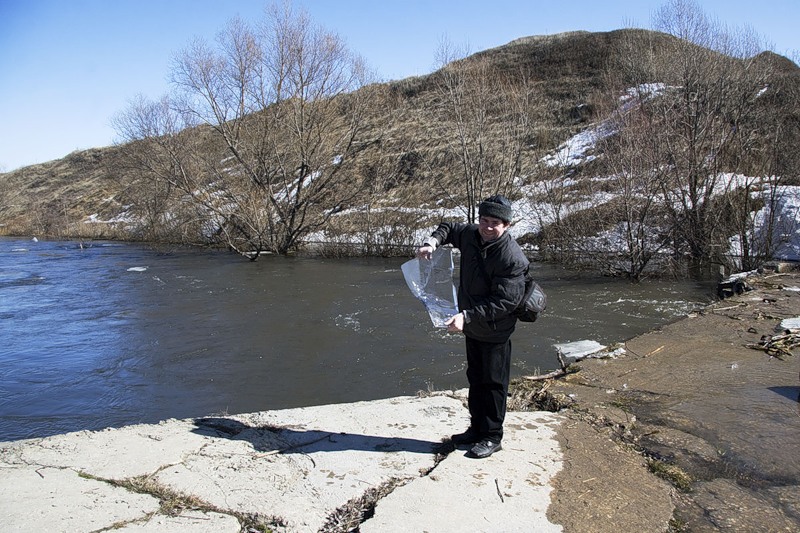 Автомобильный мост в городе слишком низкий — его залило целиком и сразу, и город теперь делится на верхний и нижний. 10 кильметров крюк для машин. Когда мы на него пришли, льдина в два удара отбила одну из перилин справа и с грохотом обрушила ее об асфальт. Аж под ногами затряслось!