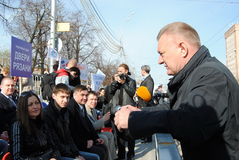На трибуне на площади Ленину демонстрантов душевно приветствовали первые лица области и города во главе с рязанским губернатором Олегом Ковалёвым, ветераны войны и труда, Почётные граждане, о чём беспрестанно объявляли в громкоговоритель.Кстати, перед демонстрацией губернатор , оказавшимися поблизости, где ответил на злободневные вопросы, касающиеся проблем тарифов на ЖКХ и . После демонстрации Олег Иванович сказал несколько слов рязанцам: