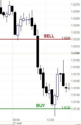 Рассмотрим небольшой пример. На рисунке перед вами график колебания курса британского фунта к доллару США за 21 мая. Допустим, что вы открыли счёт-депозит и внесли 1000$ (по курсу в рублях). Теперь, используя кредитное плечо 1:100, вы имеете возможность заключать сделки на сумму до 100 тысяч единиц базовой валюты. Эти деньги предоставит вам FOREX CLUB. Сделка совершается посредством компьютера или телефона.