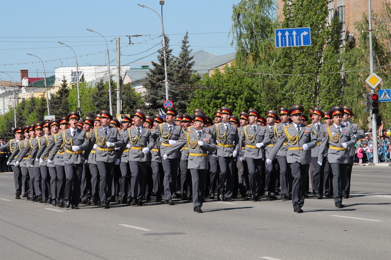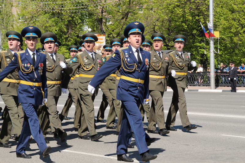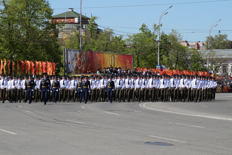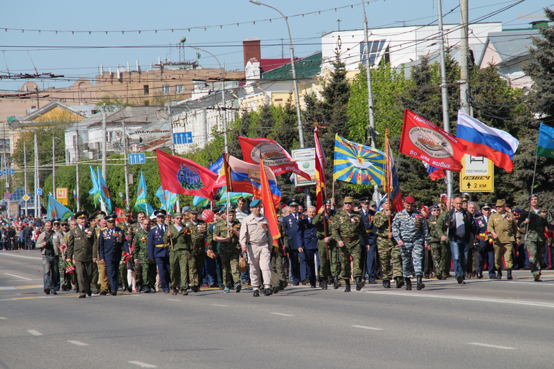 Праздник 69-й годовщины со дня Победы в Великой Отечественной войне продолжился традиционным парадом-шествием к площади Ленина. По Первомайскому проспекту стройными рядами шли парадный расчёт Рязанского высшего воздушно-десантного командного училища, воздушно-десантный факультет, факультет специальной разведки, факультет среднего профессионального образования, специальный факультет училища по подготовке военнослужащих иностранных армий. Вслед за ними парадный расчёт 137-го гвардейского парашютно-десантного полка, учебно-строевые подразделения Академии ФСИН России, структурные подразделения филиала Московского университета МВД России, Управления Министерства внутренних дел России по Рязанской области, Управления Федеральной службы судебных приставов по Рязанской области, МЧС России по Рязанской области, воспитанники кадетских классов Рязани. За гарнизоном шли ветераны, узнавались популярные лица общественных деятелей. Вслед за ними к площади с криками «Спасибо деду за Победу!» приближались участники акции «Парад победителей». Впервые в колонне парада приняли участие ветераны локальных войн и войны в Афганистане.