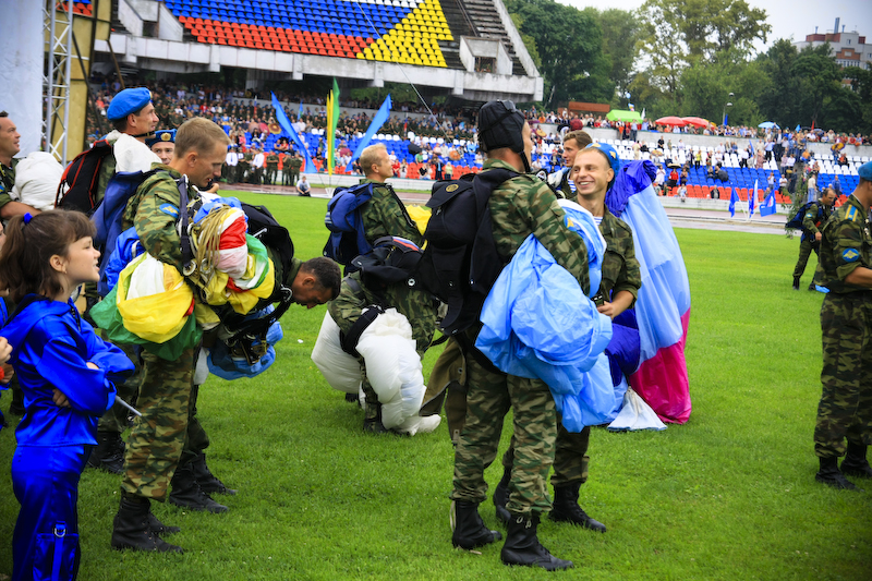 Основные мероприятия начались на стадионе ЦСК утром, однако несмотря на то, что было воскресенье, в этот день здесь было весьма многолюдно. , не только не скупились на поздравления, но и дарили призы за победы в конкурсах, которых было три, классических для десантников — притягивание каната, обычная спортивная эстафета и военная эстафета. В соревнованиях курсанты училища ВДВ участвовали поротно. Пока они выясняли, кто из них самый-самый, зрители были в восторге. Между соревнованиями проходили показательные выступления. Бои десантников, разбивание кирпичей и классических досок, на которых было написано «За ВДВ». Также на сцене выступали музыкальные коллективы, известные рязанские танцоры и спортсменки по художественной гимнастике.