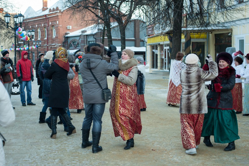 В середине Почтовой обосновались рязанские поклонники исторических танцев из студий «Русский бал» и «Губернский бал» — нарядная компания демонстрировала потрясающую морозостойкость. Впрочем, в Рязани вальсы и кадрили умудряются танцевать вообще в любую погоду: и под дождём, и под палящим солнцем, и когда ртутный столбик термометра уходит в глубокий минус. Против обыкновения зрителей здесь было на порядок меньше, чем участников, да и те тоже быстренько отправлялись учить основные танцевальные па, чтобы хоть как-то взбодриться и не примёрзнуть к модной тротуарной плитке.