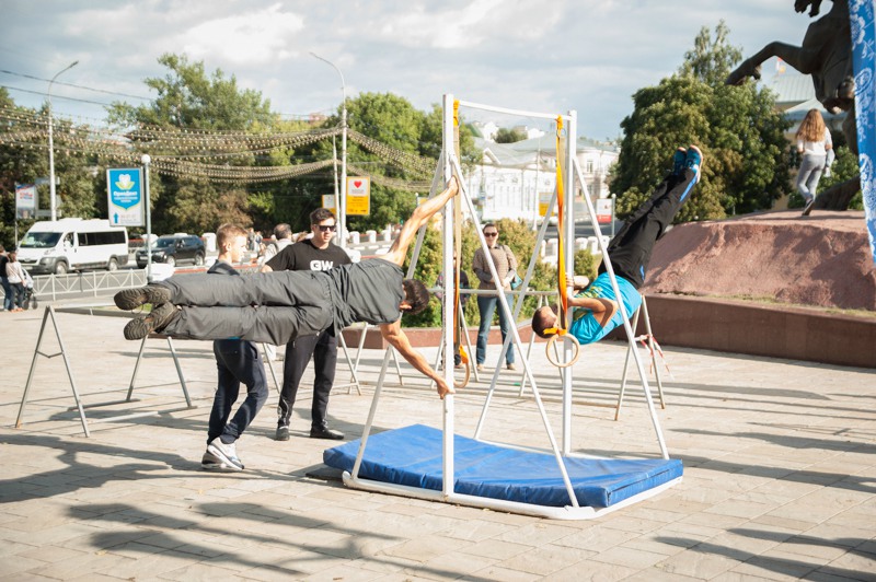 Самым массовым по числу участников и зрителей, стал Спортивный городок на площадке у памятника Евпатию Коловрату. Здесь во всей красе были представлены виды спорта, продвигаемые в нашем городе и находящиеся под патронатом управления физической культуры и массового спорта города. В центре площади состоялись показательные выступления местных юных спортсменов по самбо, кикбоксингу, греко-римской и вольной борьбе, карате, спортивным танцам, аэробике и гимнастике. Тут же развернулась площадка стритбола, неподалёку был установлен турник для фанатов воркаута. Велосипедисты демонстрировали филигранное управление двухколёсными конями в зоне фрирайдинга.