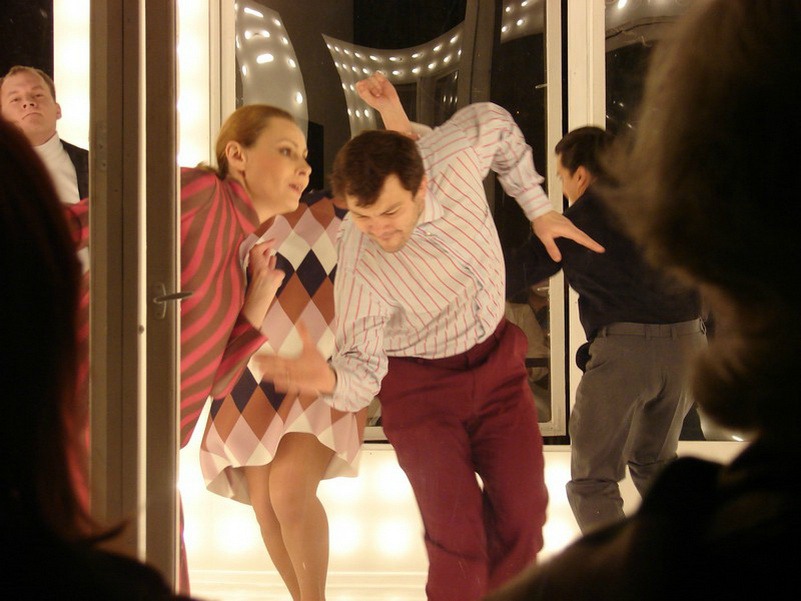 Спектакль насыщен духом СССР 1960-х годов. Если точнее – «стильных шестидесятых», в их хрестоматийном изводе, приметами которого являются дух свободы, зарождение молодёжной субкультуры и бытовая среда на стыке архаики коммуналок и «модерна» хрущёвок. Обозначить эпоху призваны не только костюмы и реквизит, но также стихи и музыка — например, один из героев наигрывает на гитаре песню Булата Окуджавы «Простите пехоте», которую Юрий Визбор исполнял в фильме Марлена Хуциева «Июльский дождь» (1966). Первым перед зрителями возникает персонаж в костюме, напоминающем дискотечный шар, возможно, гость из будущего. «Сверкающий» выступает в роли конферансье, весельчака-соблазнителя, а также судьи, разбирающего бракоразводные дела. Всё это он проделывает с некоторой глумливостью, свойственной, скорее, нашей эпохе, и словно напоминая, что так выглядит всякий, кто лезет в дела, касающиеся лишь двоих.