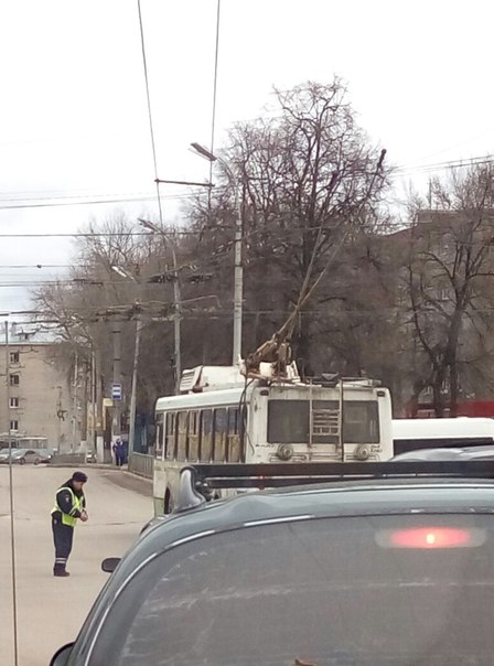 На перекрёстке Первомайского проспекта и улицы Вокзальной в Рязани у троллейбуса оторвались рога.