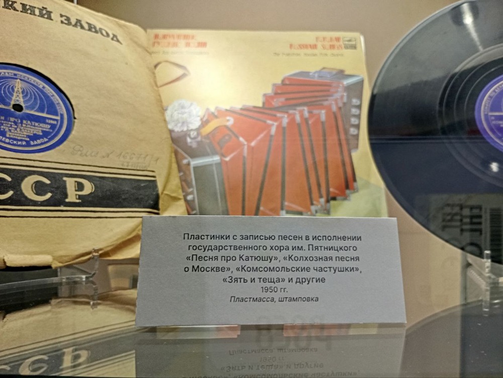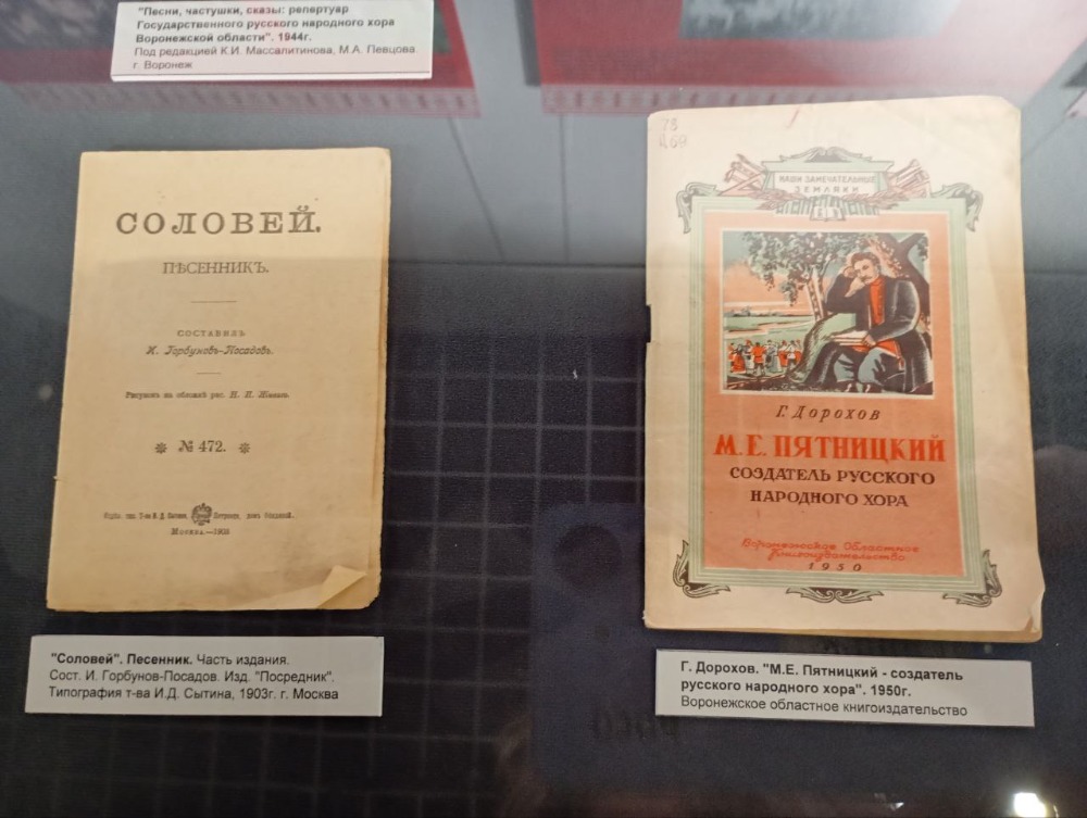 Среди экспонатов фотографии Митрофана Пятницкого, Евгения Попова и артистов музыкальных коллективов, нотные издания и песенники первой половины ХХ века, а также архивные документы, музыкальные инструменты, сценические костюмы.