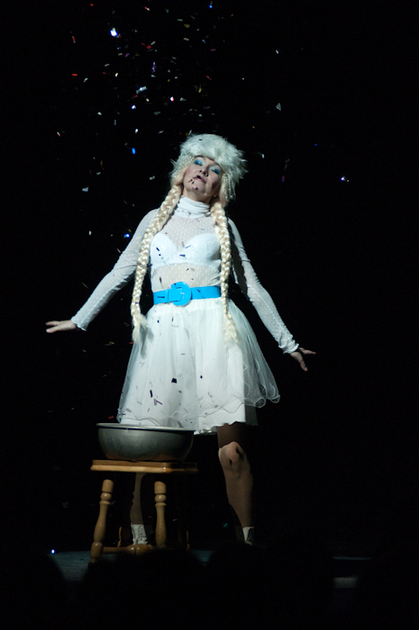 Но вернёмся к бенефису. С чего может начаться новогоднее поздравление? Разумеется, с ёлки, хоровода, традиционной «В лесу родилась ёлочка» и детских игр под руководством Снегурочки. За неимением детей, от всей души куражились и хором звали Деда Мороза дамы в вечерних платьях и кавалеры далеко за 40. Действие плавно перетекло на сцену театра, где нашлось место и торжественным речам, и юмористическим поздравлениям, — в результате Валерий Михайлович оказался облобызован импульсивными поклонницами, завален цветами и даже посвящён в индейцы. А чуть припозднившийся Дед Мороз подарил ему главный подарок — выступление на сцене театра под аккомпанемент настоящей музыкальной группы.