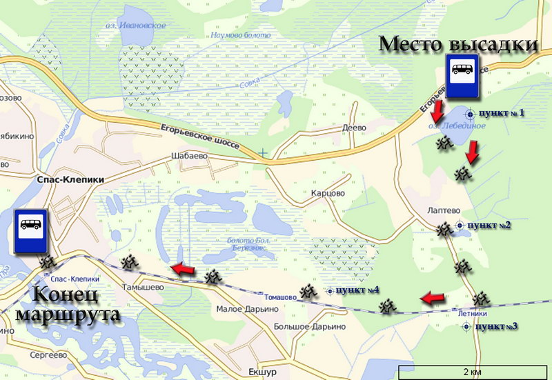 В пути можно встретиться с другим символом ушедшей эпохи (смотрим на карте пункт №4). Деревня Большое Дарьино встречает гостей красным советским знаменем. Не заметить такой флигель и пройти мимо просто невозможно, хозяин явно угадал с опознавательным знаком. Где-то у деревни Тамышево уже ничто не будет напоминать ни о советском строе, ни об ужах, ни даже об узкоколейке — насыпь превратится в накатанную колею, которая быстро приведёт в Клепики. Такой непритязательный весенний маршрут уложится в двухчасовую поездку на автобусе (туда-обратно) и пятичасовую десятикилометровую прогулку по еловому лесу. Путешествуйте и помните, что иногда один день, проведённый в других местах, даёт больше, чем десять лет жизни дома.