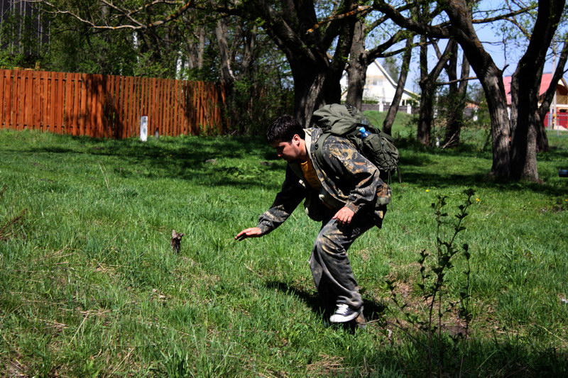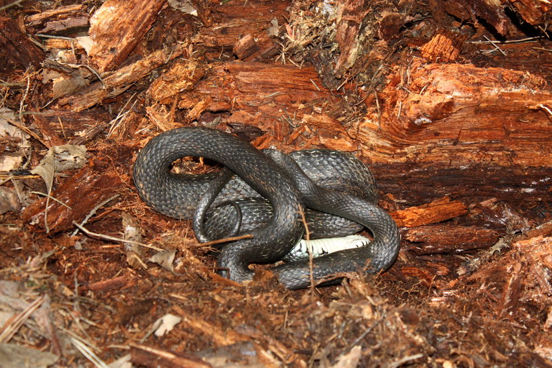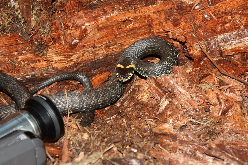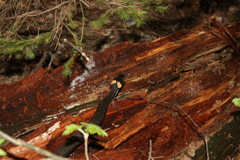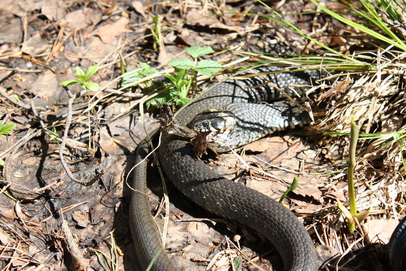 Получается, что справа — лес, слева — озеро, а вокруг — никого. Не сказка ли? Компенсирует непреодолимое желание искупаться отсутствие комаров. Правда, май отличается наличием прочих тварей. Их можно встретить в огромном количестве именно тогда, когда ночью ещё холодно, а кушать очень хочется. Днём на охоту выбирается сумеречное животное — уж обыкновенный. И по своему обыкновению ужи — змеи трусоватые. При появлении человека дают стрекача, пытаясь скрыться под пнём-колодой или вплавь. Потому у отдыхающих, недавно разжившихся мыльницей, традиционная фотка ужа — едва различимый чёрный хвост. Причём, этой фотографией многие горделиво хвастают перед товарищами. Признаемся, и мы до недавнего времени не отличались оригинальностью. Пока не поленились проследить за ходом мысли ужа. При встрече с мясистой змеюкой мы первые десять минут с обоих флангов отбивали ей путь к озеру. Смелости добавляли детские знания, что уж — змея неядовитая.