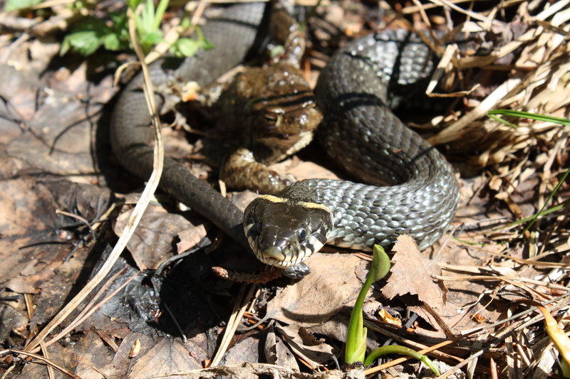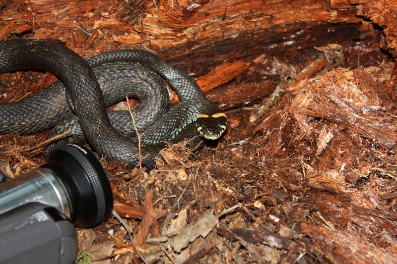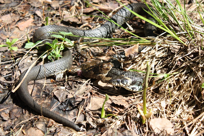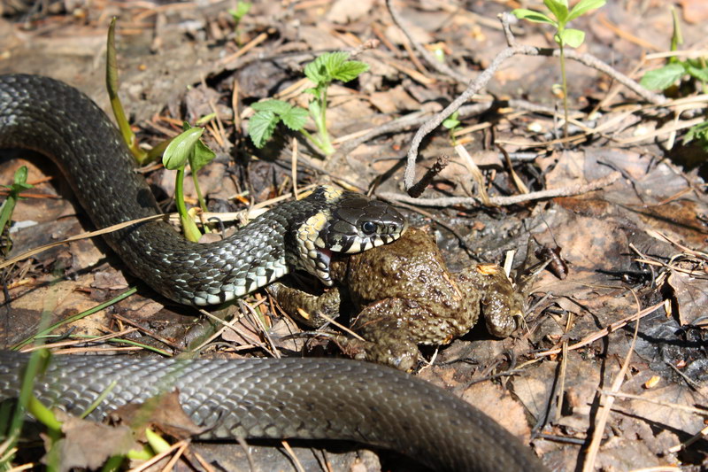 Но вторая встреча обещала быть интересней. Уже через сто метров мы встретились со вторым ужом. Он был занят французским завтраком: из пасти торчали лягушкины лапы. Встрече с нами и этот уж был явно не рад. А оставленная рядом с ним видеокамера его откровенно раздражала. Он показательно отрыгнул лягушку и усердно зашипел на непрошеных гостей. И, о чудо! Еда внезапно приподнялась и, не поверив своему счастью, принялась старательно дышать. Но как оказалось, намерения ужа не брали во внимание будущее квакши, и на наших глазах он раздвинул пасть и вцепился в лягушачью лапку. Поняв, что так позавтракать не удастся, змей снова выплюнул жертву, ополз её и принялся заглатывать огромную лягву прямо с головы. Но аппетит был безвозвратно испорчен: подержав добычу в пасти с минуту, уж отплевался и пустился наутёк.