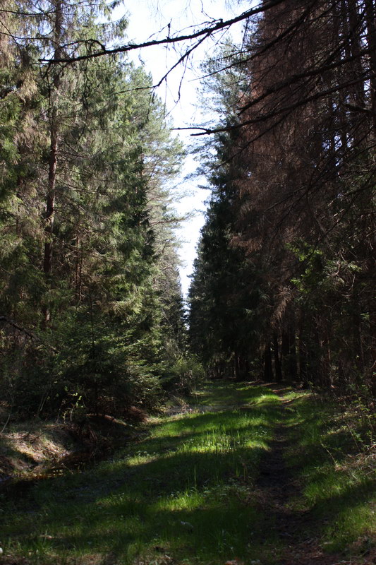 Попрощавшись с голодным ужом, мы двинулись в сторону узкоколейки. Хитрость этого участка пути в том, что каких-то два километра могут растянуться для аккуратного туриста часа на два. Короче тем, кто предпочитает «гору обходить», — добро пожаловать по дороге через деревню Лаптево (смотрим на карте пункт №2). Гарантированны: огромные болотные лужи и бурелом. А вокруг ёлки, ёлки, ёлки…. То и дело в приятели напрашиваются всё те же ужи.