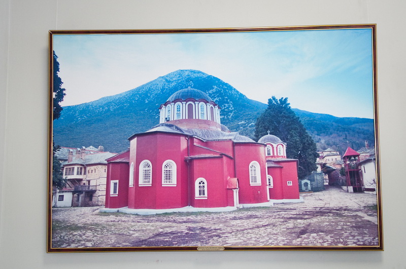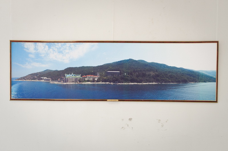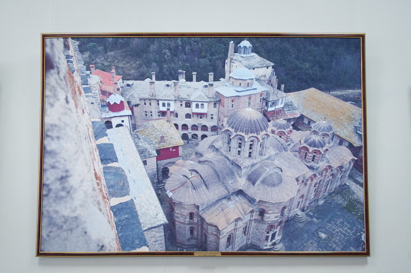 Впрочем, выставка «Гора Афон — сияние святынь. Сто фотографий на полотне святогорских монастырей» привлекает не только тематикой, но и исполнением — все фотографии распечатаны на холсте. Правда, не на полотне святогорских монастырей, как можно подумать, если вдумчиво прочитать название, а на обычной текстурной ткани. Тем не менее, крупноформатные работы действительно выглядят весьма необычно и декоративно. Для удобства просмотра все залы выставки посвящены отдельным монастырям, содержат информационные стенды с бытописанием и историей культовых мест, а каждая фотография имеет подпись, поясняющую, где она сделала. В противном случае непосвящённому зрителю немудрено заблудиться — архитектура монастырей и хозяйственные постройки на территории Афона очень похожи. А так как план выставочного зала позволяет обойти всю экспозицию по кругу, возникает ощущение бесконечного кружения в лабиринте домиков и мощёных булыжником улочек, мимо одних и тех же стен, башенок, окошек. Хотя, если приглядеться повнимательнее, ощущение дежавю оказывается не ошибочным — в экспозиции встречаются дублированные фотографии. Причём не просто одни и те же архитектурные объекты, снятые с одной и той же точки (хотя таковых тоже хватает), но и вовсе одинаковые снимки, распечатанные с одного и того же кадра. Объяснить причину такого нетипичного поступка сложно — не то работ на все стены не хватило и пришлось имеющиеся дублировать, не то одинаковые работы повесили по недосмотру. Однако красоту фотографий это ничуть не умаляет.