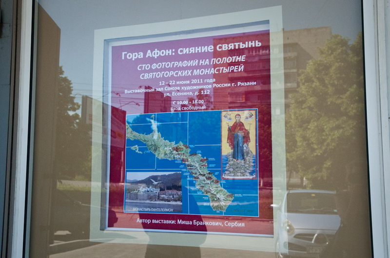 Выставка «Гора Афон — сияние святынь» была организована Русским Афонским обществом, комитетом по культуре правительства Москвы, общественным советом Центрального федерального округа и Фондом святых равноапостольных Константина и Елены и в начале июня с аншлагом была показана в столице. В Рязани интерес к христианским святыням оказался умеренным. Как посетовал на открытии выставки игумен Лука, заведующий кафедрой теологии Рязанского государственного университета и директор православной гимназии, громкий интерес среди рязанцев вызывает лишь скандальная тематика. Так что вернисаж прошёл в довольно тесном кругу, зато под духовную музыку — на открытии выступил хор отделения теологии под руководством Константина Михайлова.