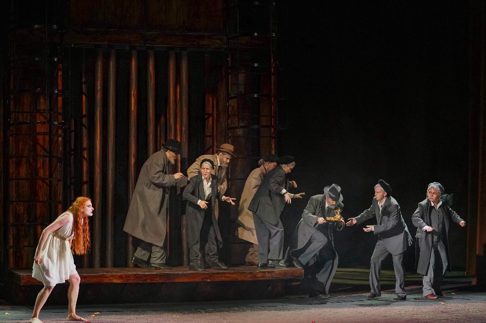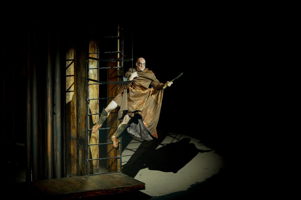 Отдельно хочется отметить оригинальную конструкцию декорации, расположенную на поворотном круге сцены. С одной стороны — дозорная башня и колесница, с другой — олицетворение царской власти и пути как к её вершине, так и в небытие.