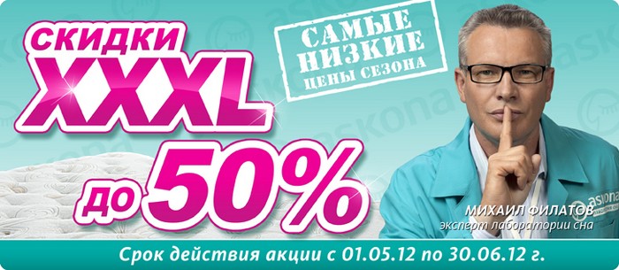 Компания Askona приглашает за покупками в фирменный салон на третьем этаже МЦ «4 комнаты». Только сейчас в рамках акции XXXL можно приобрести кровати, ортопедические матрасы и аксессуары со скидкой до 50%. Обратите внимание: действует беспроцентная рассрочка.