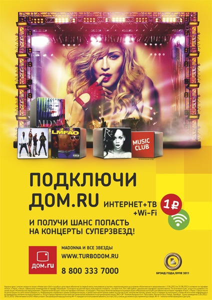 Проект «Музыкальный клуб», реализованный на базе собственного мультимедиа ресурса «Дом.ru», ― развлекательного портала «TurboDom», ― это новый формат потребления музыки и развлекательного контента. , абоненты тарифных планов «Гига», «Тера» и «Экса» получают не только доступ к играм, онлайн-видео, софту, книгам и антивирусам, но и дополнительные возможности членов «Музыкального клуба». Авторизованные пользователи могут качать лицензионные треки из более чем 307 тысяч музыкальных альбомов, обновляющихся еженедельно, формировать плей-листы, слушать музыку как онлайн, так и оффлайн при помощи специального приложения для смартфонов, а также получить уникальный шанс встретиться со звёздами музыкального мира. В рамках акции «Дом.ru» доставит вам звезду» Россию посетит британская группа Hurts, чьё дебютное видео на сингл «Wonderful Life» собрало на YouTube около 20 миллионов просмотров.