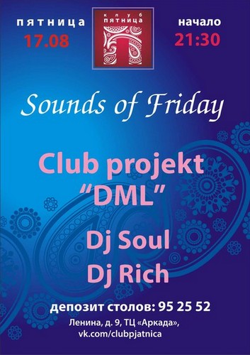 Ночной клуб-ресторан «Пятница», расположенный в цокольном этаже галереи моды «Аркада», приглашает рязанцев весело провести уик-енд. Живой звук ждёт здесь всех ценителей музыки в пятницу, 17 августа 2012 года. Для гостей сыграет Club projekt «DML», а танцевальные ритмы зададут Dj Rich and Dj Soul. В субботу атмосферу весёлой вечеринки будут создавать ребята из группы «Bit Mix», в их репертуаре – песни Элвиса Пресли, Roxette, U2, Sting, А-Студио.