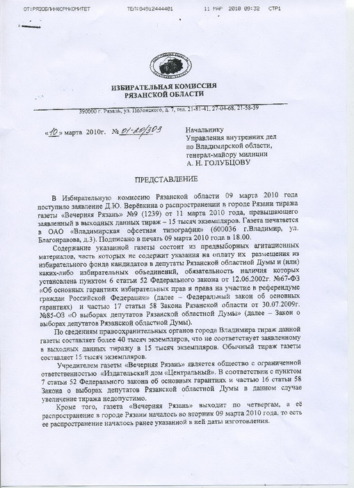 Облизбирком обратился в УБЭП УВД по Владимирской области («Вечерняя Рязань» печатается во Владимире) с просьбой проверить, соответствует ли тираж, заявленный в выходных данных газеты, действительности. По сообщению рязанского облизбиркома, был получен ответ, что по состоянию на 09.00 10 марта в типографии было напечатано 50 тысяч экземпляров, кроме этого, было обнаружено письмо от издательского дома на выпуск 234 тысяч экземпляров газеты «Вечерняя Рязань». Тираж был изъят