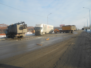 15 января в 12.40 в Рязани на участке дороги Южного промузла произошло столкновение трёх грузовых автомобилей. 44-летний житель областного центра, управляя автомобилем «Shaanqi» выехал на полосу встречного движения, где совершил столкновение с автомобилем КамАЗ и следовавшим за ним тягачом «Skania» с прицепом, под управлением жителя Тверской области.