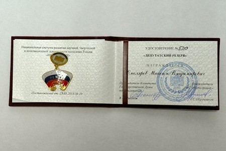 Ещё одна церемония состоялась в Государственной Думе Федерального Собрания Российской Федерации. Максим Смоляров был награждён дипломом за победу с конкурсной работой «Вопросы взаимодействия общества и государства в рамках деятельности пенитенциарных учреждений в Российской Федерации», также ему вручён знак отличия «Депутатский резерв».