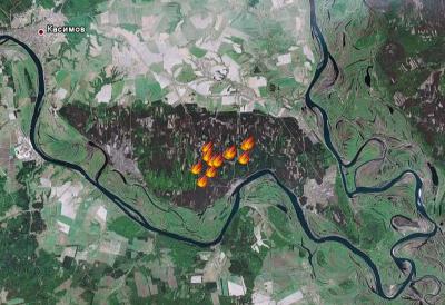 Согласно данным пожарной информационной системы FIRMS, крупный пожар разгорелся в лесном массиве, расположенном на левобережье Оки в Рязанской области, в пятнадцати километрах к юго-востоку от Касимова и в километре к северу от деревни Сосновка, сообщает