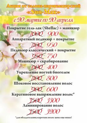 Напомним, салон-парикмахерская SunMax предлагает рязанцам расширенный спектр услуг: парикмахерские услуги; ногтевой сервис; эстетика лица и тела; косметология; перманентный макияж; визаж; моментальный загар; солярий; персональное сопровождение шопера; услуги стилиста; профессиональная косметика. Сертифицированные мастера с многолетней практикой предоставляют качественные услуги по созданию неповторимого стиля для каждого клиента, проконсультировать в вопросах по уходу за волосами и телом. В салоне SunMax готовы помочь грамотно подобрать образ, а также сопроводить в покупках с профессиональным шоппером. Уютная атмосфера салона окутает каждого посетителя нежностью и комфортом. Подробности по телефону: (4912) 95-72-95, 8-920-987-70-07. Время работы: 10:00-22:00 (возможно предоставление услуг салона в ночное время).