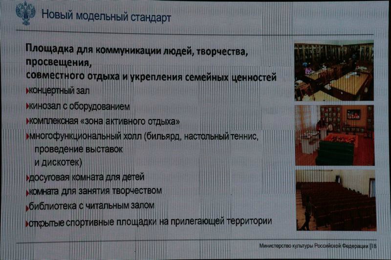 Впервые на совете по культуре на повестку дня был поставлен один единственный вопрос — он коснулся развития учреждений культуры в малых городах и сёлах. Речь шла о модернизации и строительстве новых ДК на селе, ряде программ, в том числе о совместном с «Единой Россией» проекте «Местный дом культуры». Обсудили реализацию программы по строительству центром культурного развития в малых городах, создании инновационных культурных центров, программу кинофикации малых и средних городов.