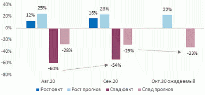 Компонента инвестиций снизилась в равной степени из-за сокращения как фактических, так и ожидаемых показателей. Доля компаний, наращивающих инвестиции, сократилась за месяц на 4% и составила 14%, а сокращающих, наоборот, выросла до 21% по сравнению с августом.
