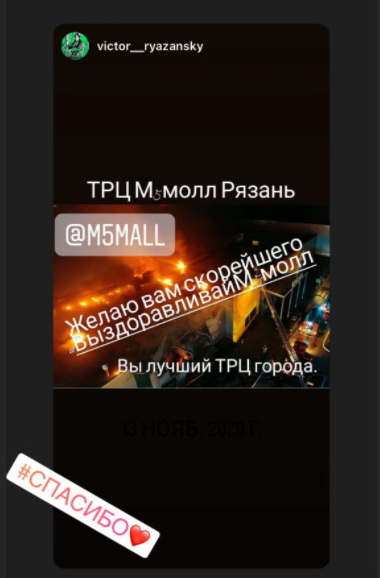 Рязанцы в соцсети Instagram устроили флешмоб в поддержку ТРЦ «М5Молл», пострадавшего от пожара. Жители города публикуют в своих аккаунтах фото торгового центра с хештегом «ВыздоравливайМ5Молл». Руководство «М5 Молл» поблагодарило рязанцев за поддержку, отметив, что она очень важна для сотрудников торгового центра.