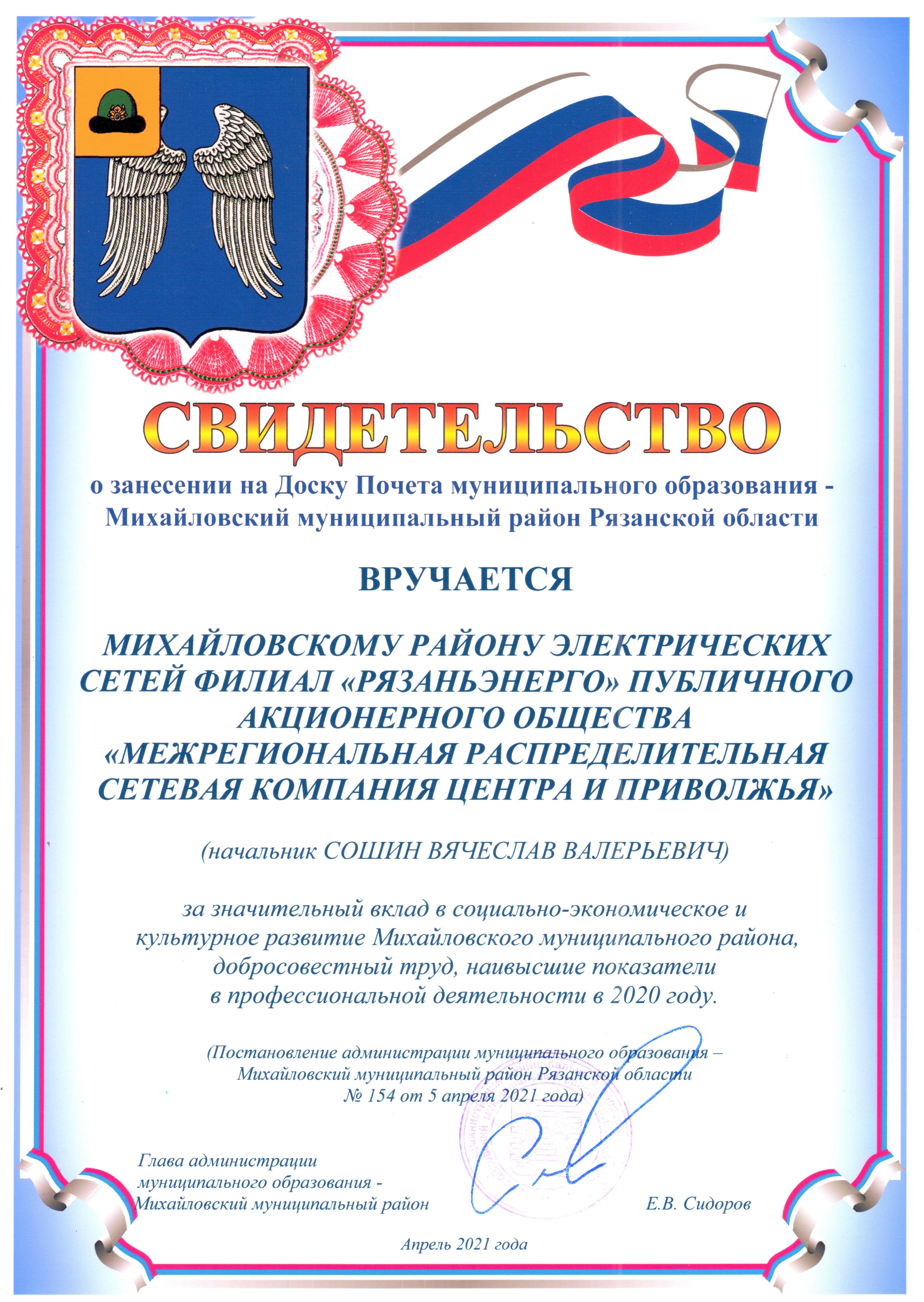 «Рязаньэнерго» занесли на Доску Почёта Михайловского района Рязанской области