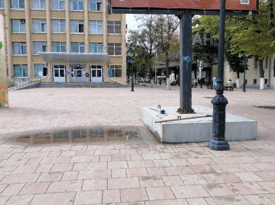 В ролике видно, как мужчина подцепляет воду из лужи металлической лопатой, звонко задевая при этом плитку, и «кладёт» в стоящее рядом ведро.