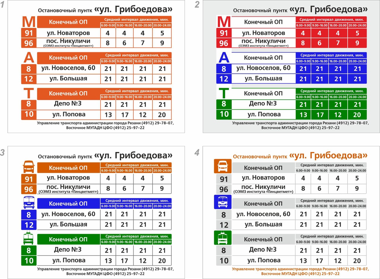 Дизайнеры предложили сделать табло в однотонном варианте — оранжевый цвет, а также в разноцветном — присутствует красный (оранжевый), синий и зелёный цвета, обозначающие соответствующие виды транспорта (маршрутку, автобус и троллейбус). Когда именно рязанцы смогут увидеть их на остановочных пунктах города, не уточняется.
