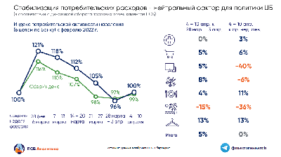 В целом потребители вернулись к нормальным темпам повседневных покупок, дальнейшему сжатию спроса препятствует инфляция, которая к 10 апреля с начала марта могла составить около 9%. После снижения ключевой ставки до 17% для Банка России наблюдаемая стабилизация потребительской активности, скорее, является нейтральным фактором.