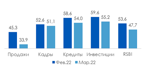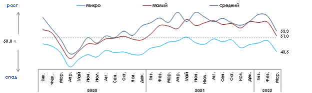 Индексы бизнеса всех размеров показали снижение в марте, однако показатели малого и среднего удержались выше 50 пунктов. В марте малый и средний бизнес не отметил значительных шоков от санкций — найм сотрудников всё ещё превышал сокращения, кредиты сохранились на высоком уровне, инвестиционная активность практически не снизилась. Наиболее резко отреагировал на санкции микробизнес, который имеет наименьшую финансовую устойчивость в подобных условиях.
