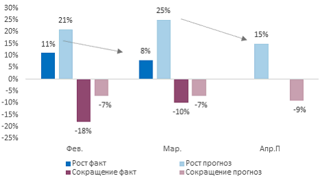 В ближайшие три месяца роста выручки ожидают 20% МСБ, и это на 10% меньше, чем месяцем ранее, а сокращения выручки ждут уже 47% против 23% в феврале.