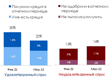 Доля МСБ, получивших отказ в отчётном периоде, выросла на 2% по сравнению с февралем и достигла 11%, а тех, кто смог получить кредит, — снизилась до 9%. В итоге, среди тех, кто обращался за кредитом в последние месяцы, большая часть получила отказ.