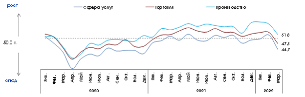 Индексы всех сфер деятельности снизились более чем на 5 пунктов. Индекс в торговле опустился ниже 50 пунктов впервые с января прошлого года. Ожидается, что в апреле снижение продолжится.