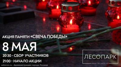 Сайт мэрии Рязани о том, что 8 мая в 21.00 в преддверии празднования 77-й годовщины Победы в Великой Отечественной Войне на территории Лесопарка пройдёт акция памяти «Свеча Победы». Мероприятие состоится на территории парка впервые. В рамках акции планируется зажечь свечи участников в память о героях, которые отдали свою жизнь за Родину. Кульминацией события станет выложенное слово «ПОБЕДА» из лампад.