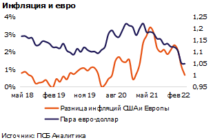 На внешних рынках стоимость евро в долларах опускалась к минимумам 2017 года, однако сумела частично восстановиться. Возможность того, что пара евро-доллар уйдет ниже 1, остаётся, однако только в пределах первой половины 2022 года. Все из-за разницы в проводимых ДКП ФРС и ЕЦБ. ФРС уже приступил к ужесточению своей политики, когда ЕЦБ пока запаздывает, ввиду чего возможно продолжение удорожания доллара к евро, а разница инфляций продолжит снижаться. При этом, разница коротких ставок США и Германии демонстрируют снижение, на фоне замедления их роста в США и продолжающегося увеличения в Германии, что говорит о сохранении макроэкономического давления в еврозоне. Аналогичная, но более сдержанная динамика в длинных ставках, которые олицетворяют экономическое положение дел в странах. Во второй половине года мы ожидаем возвращения пары евро-доллар к 1,1 на фоне замедления инфляции в США, а также более жёсткой ДКП со стороны ЕЦБ.